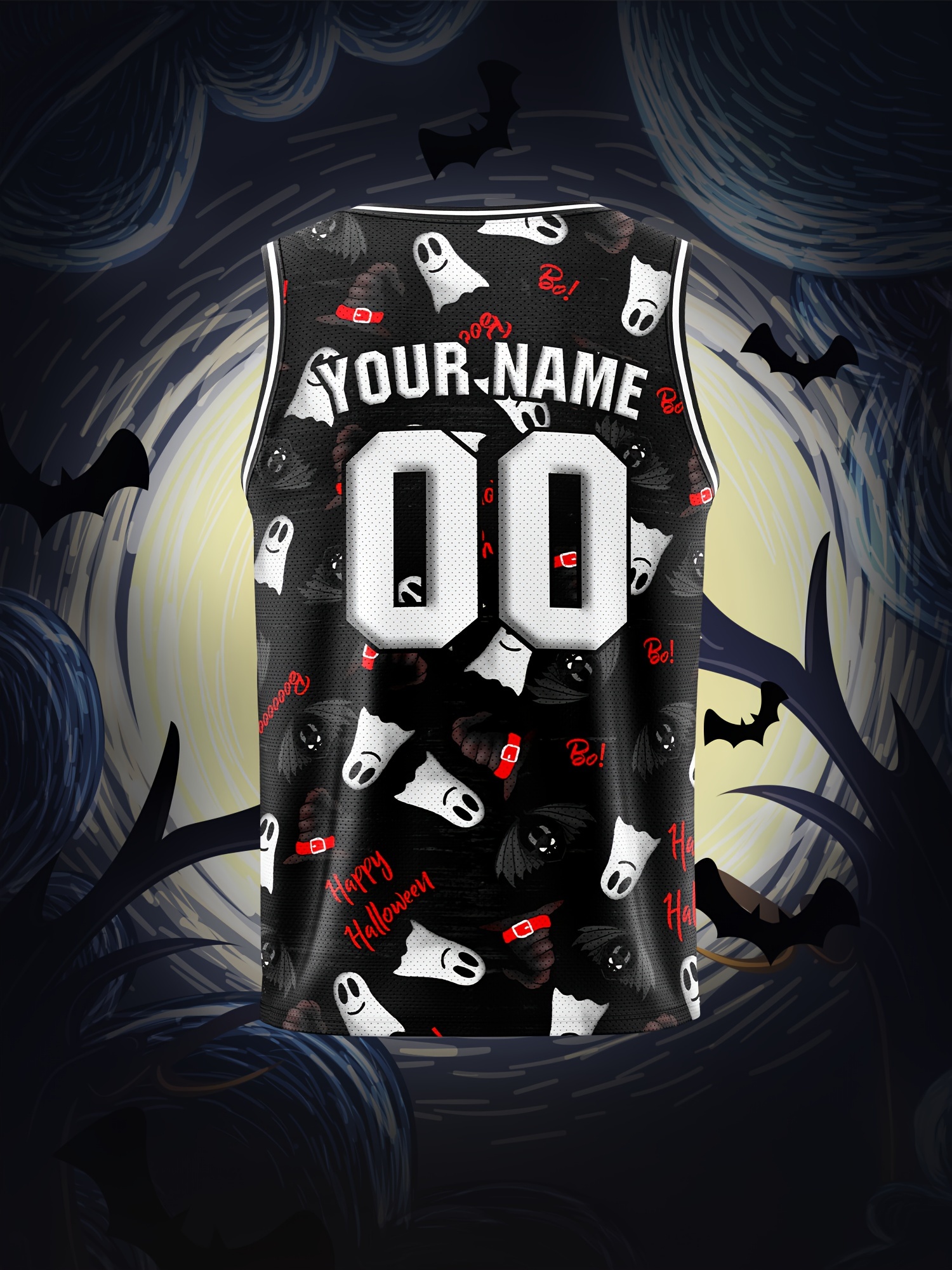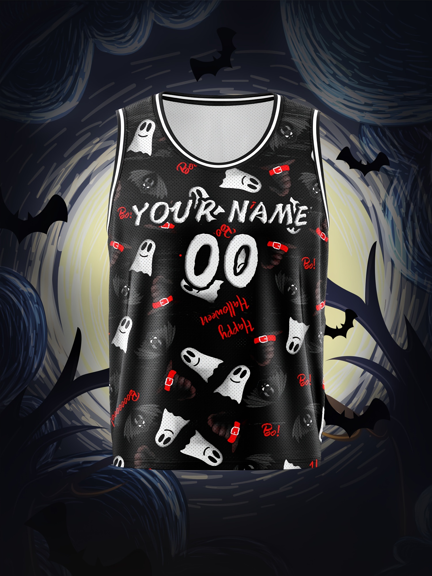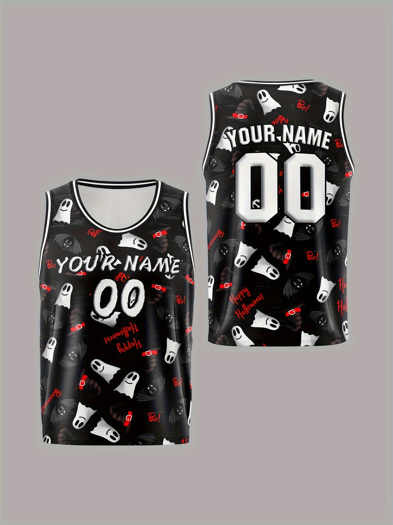 Customized Name And Number Boy's Basketball Sports Vest, Halloween Theme Ghost And Bat Pattern Print Breathable Vest For Game Team Training Outdoor Sports Running Workout
