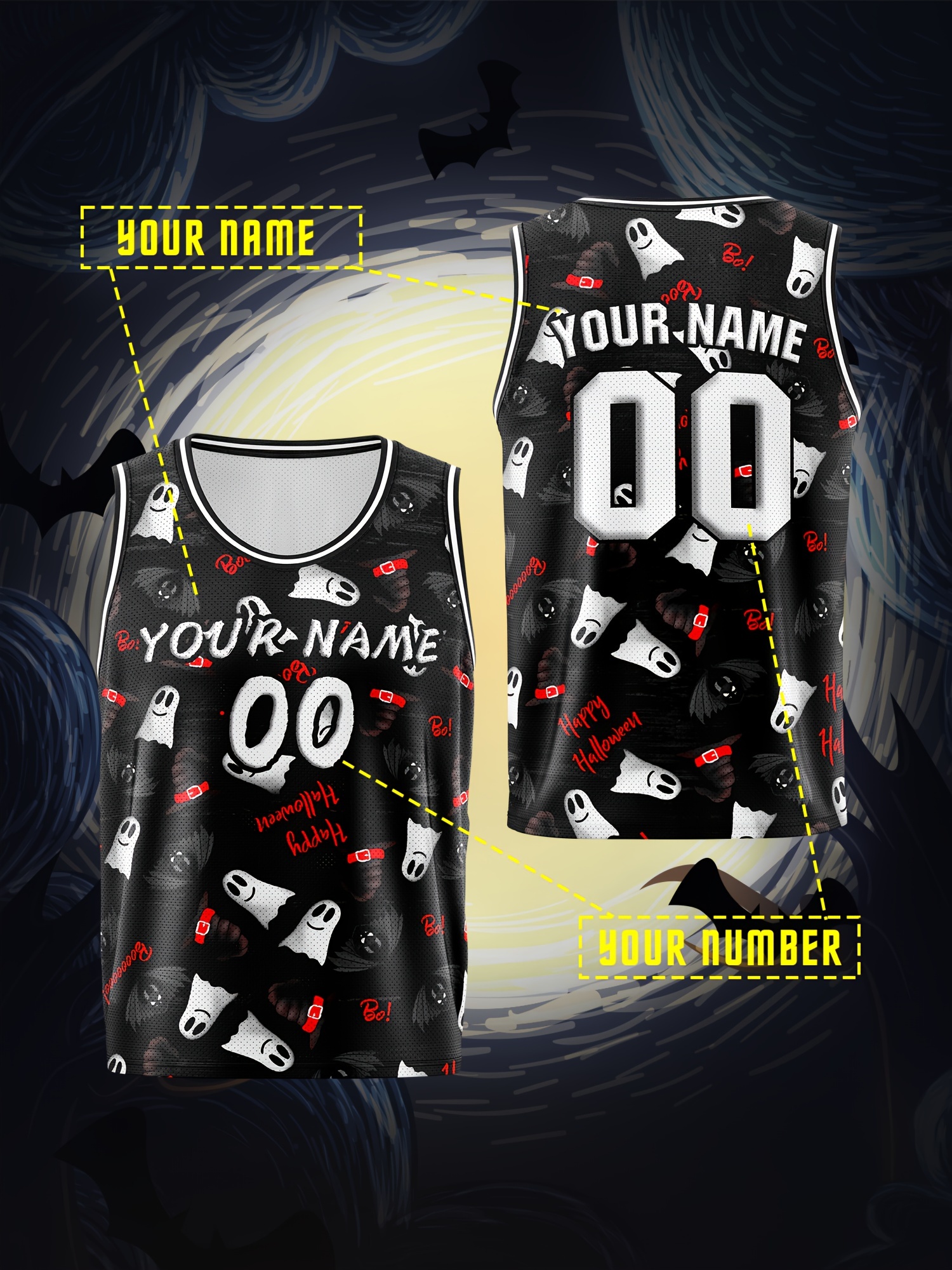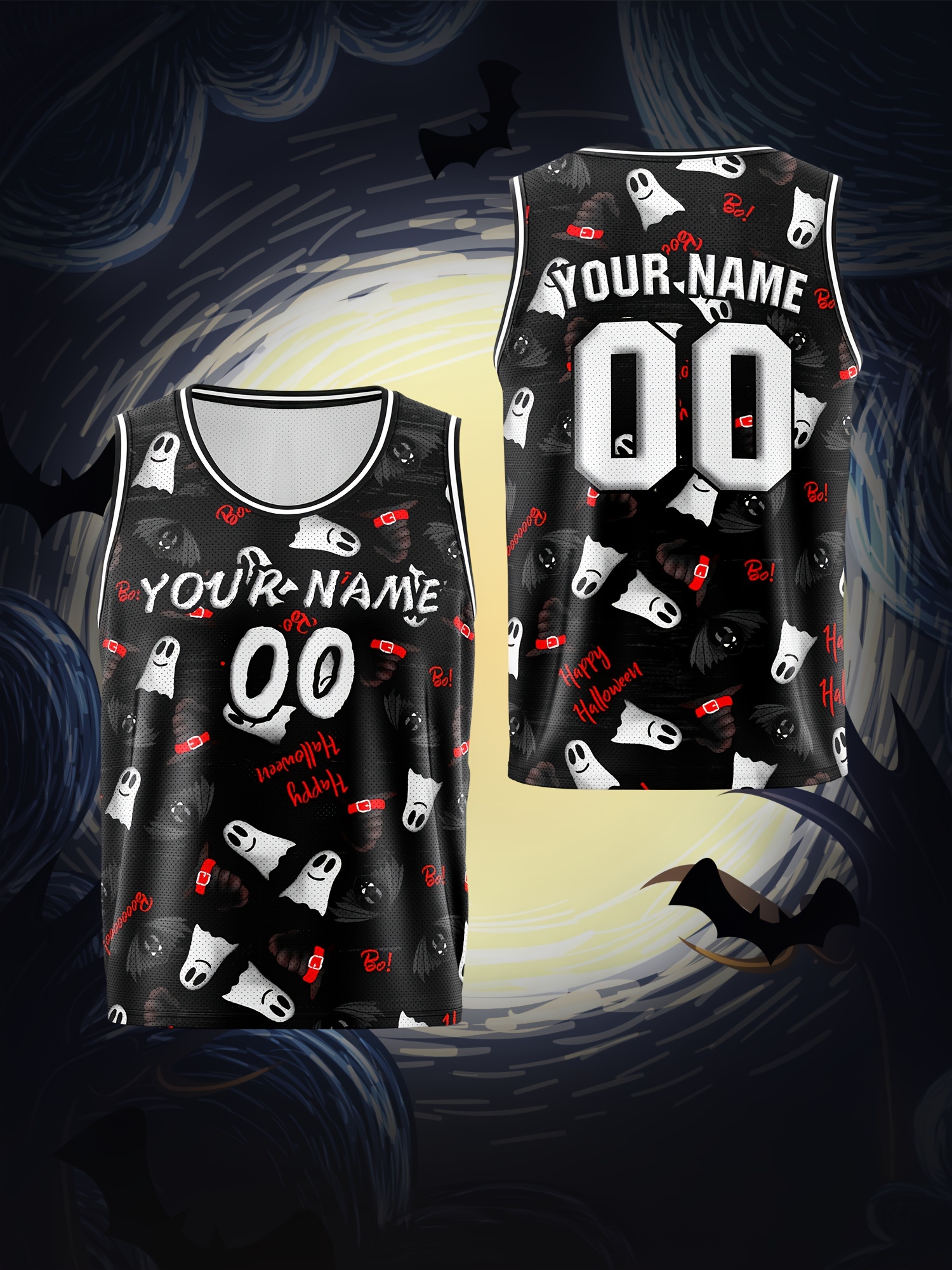 Customized Name And Number Boy's Basketball Sports Vest, Halloween Theme Ghost And Bat Pattern Print Breathable Vest For Game Team Training Outdoor Sports Running Workout
